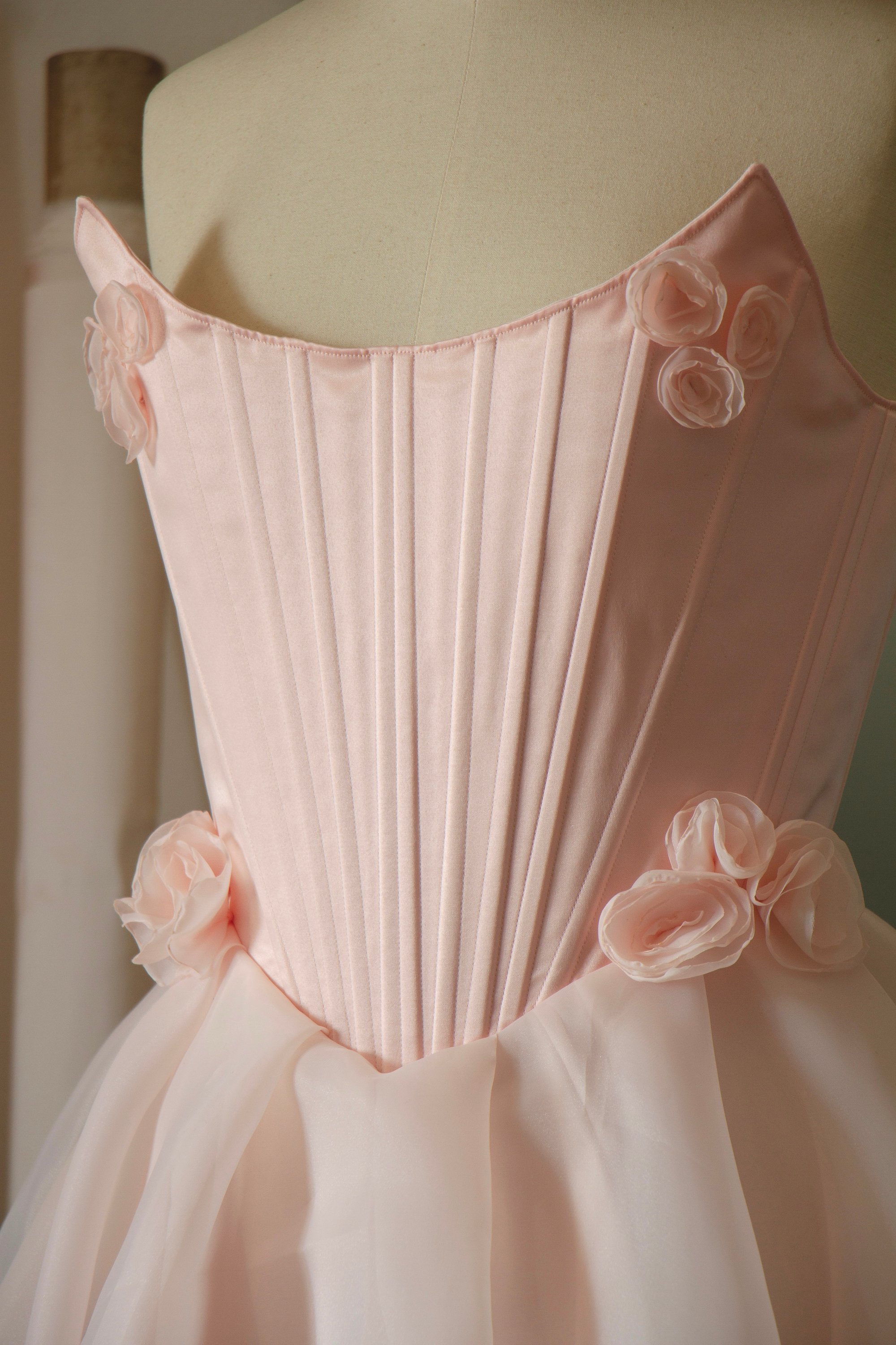 Handcrafted in Italy, this corset dress is a fairytale piece inspired by blossoming peach flowers and the gentle spirit of spring.