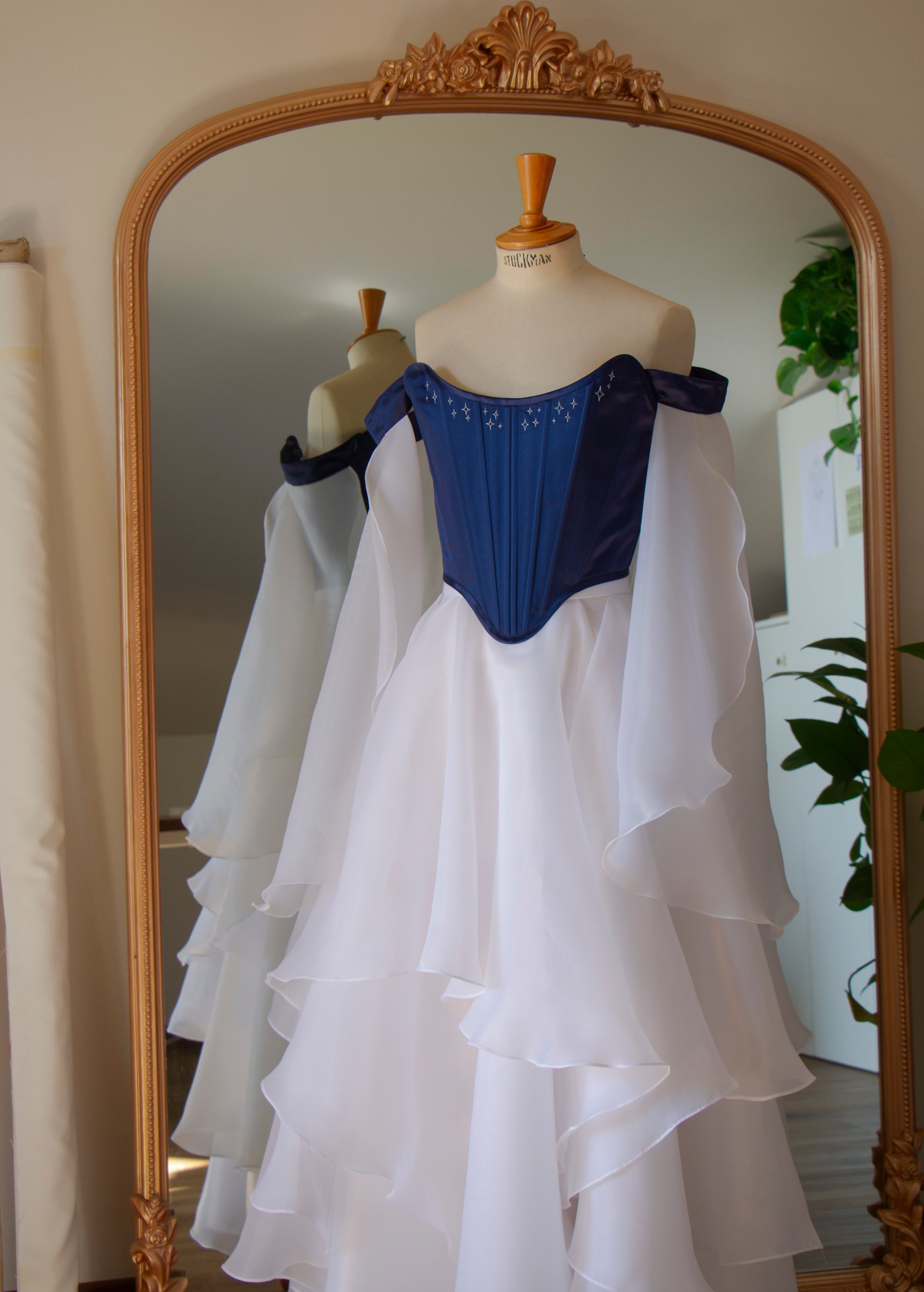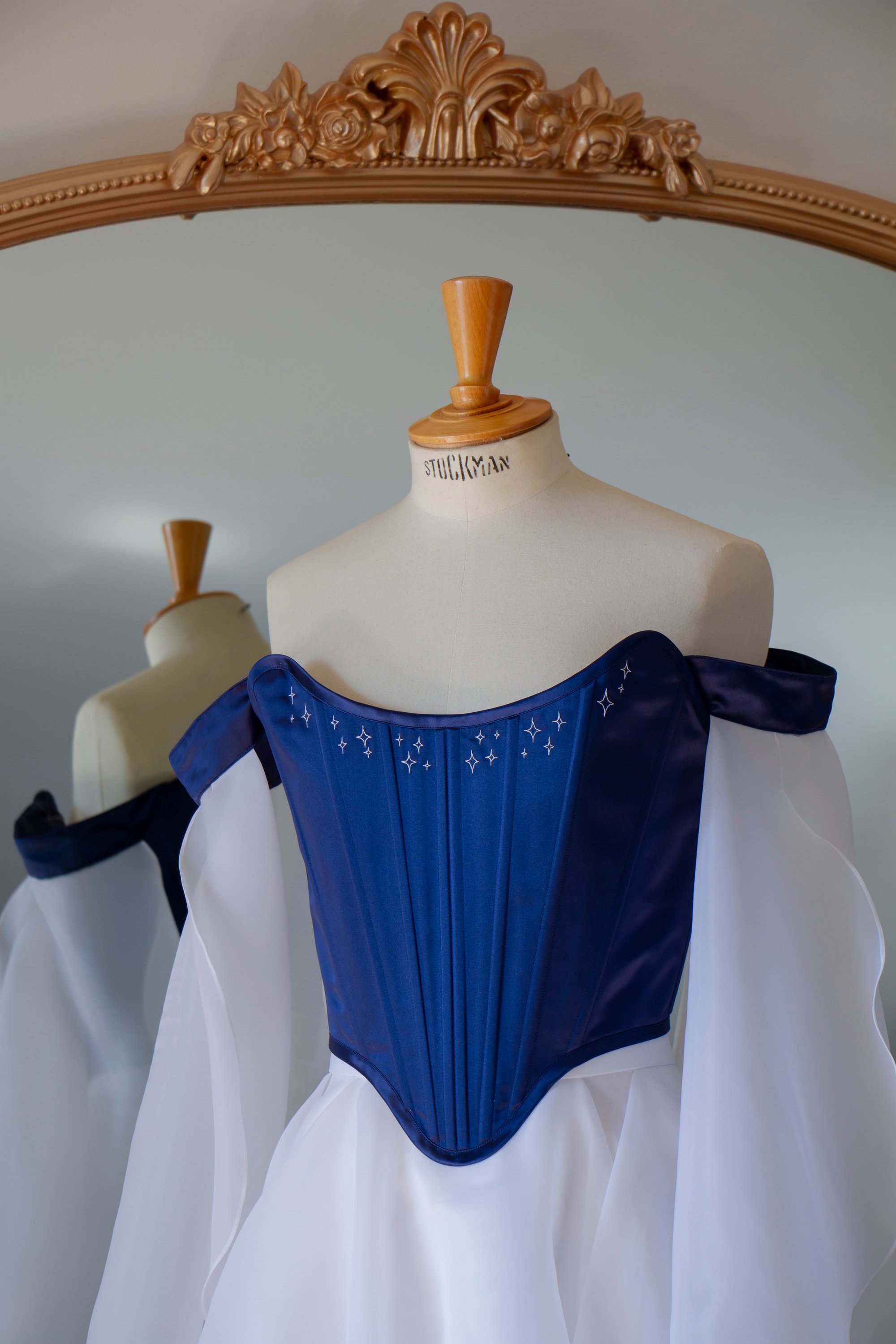 The corset, shaped with a XVIII century influence, is fully structured with boning to sculpt the waist and create a defined hourglass silhouette. Crafted in pure silk on the outside and lined in pure cotton for comfort and breathability, it balances structure and softness with effortless elegance. The neckline is delicately hand embroidered with tiny stars, adding a subtle, poetic detail.