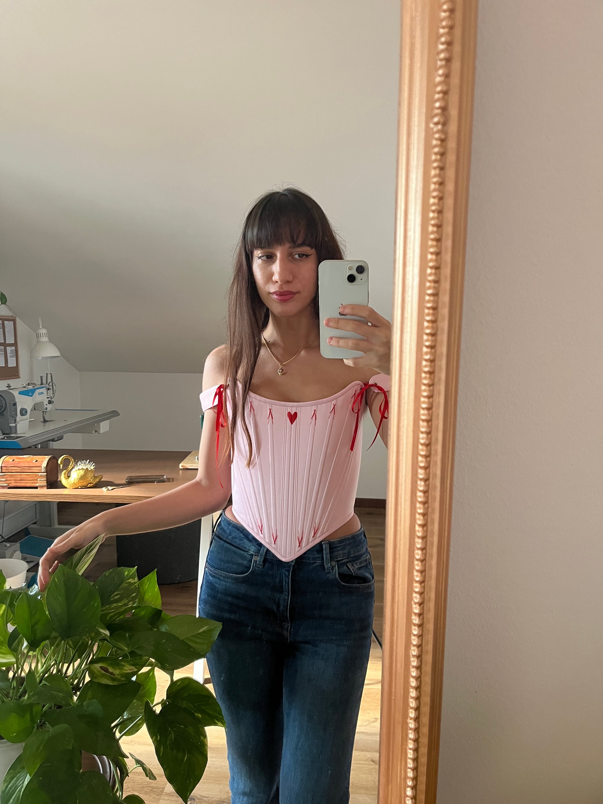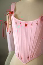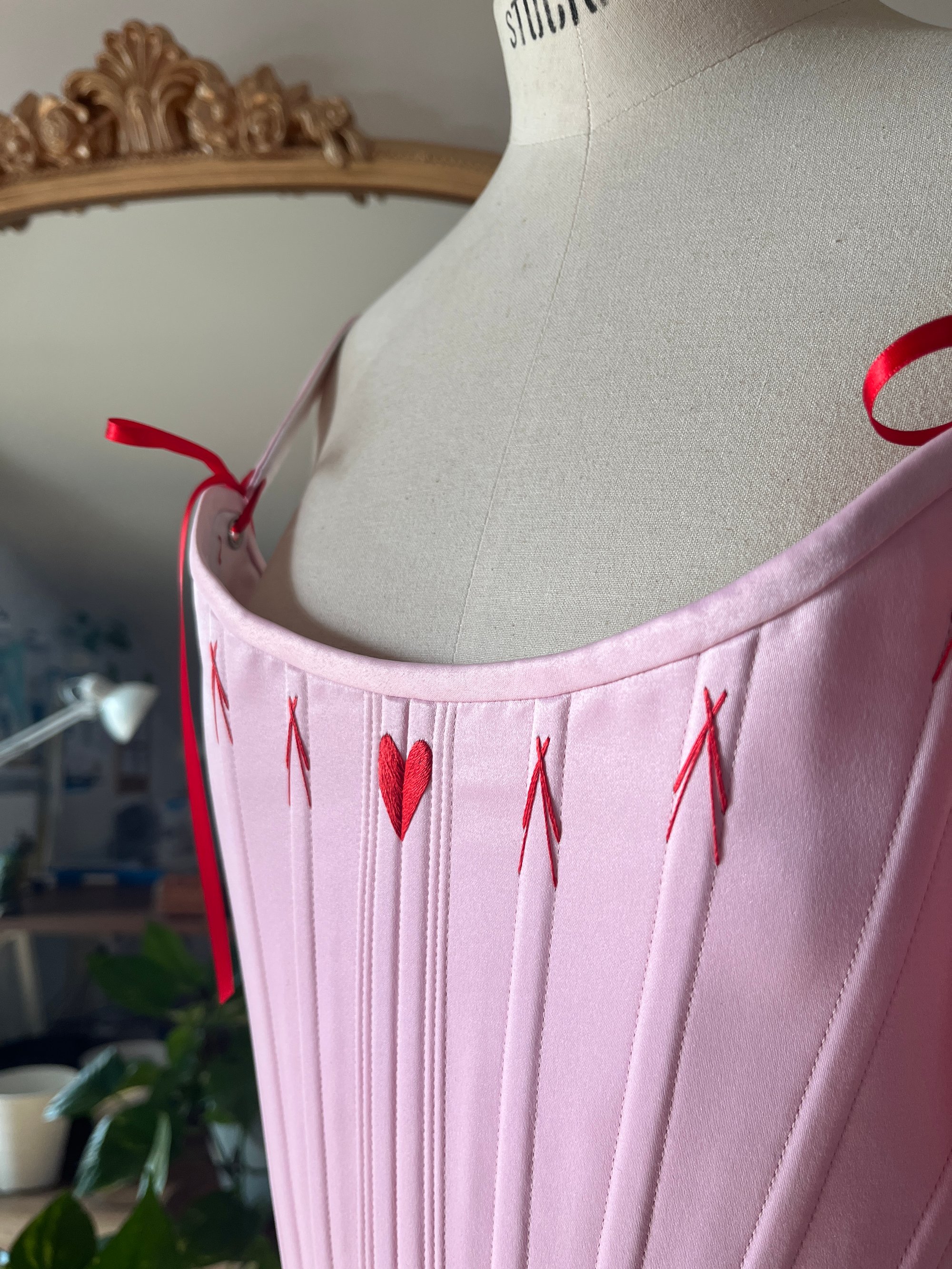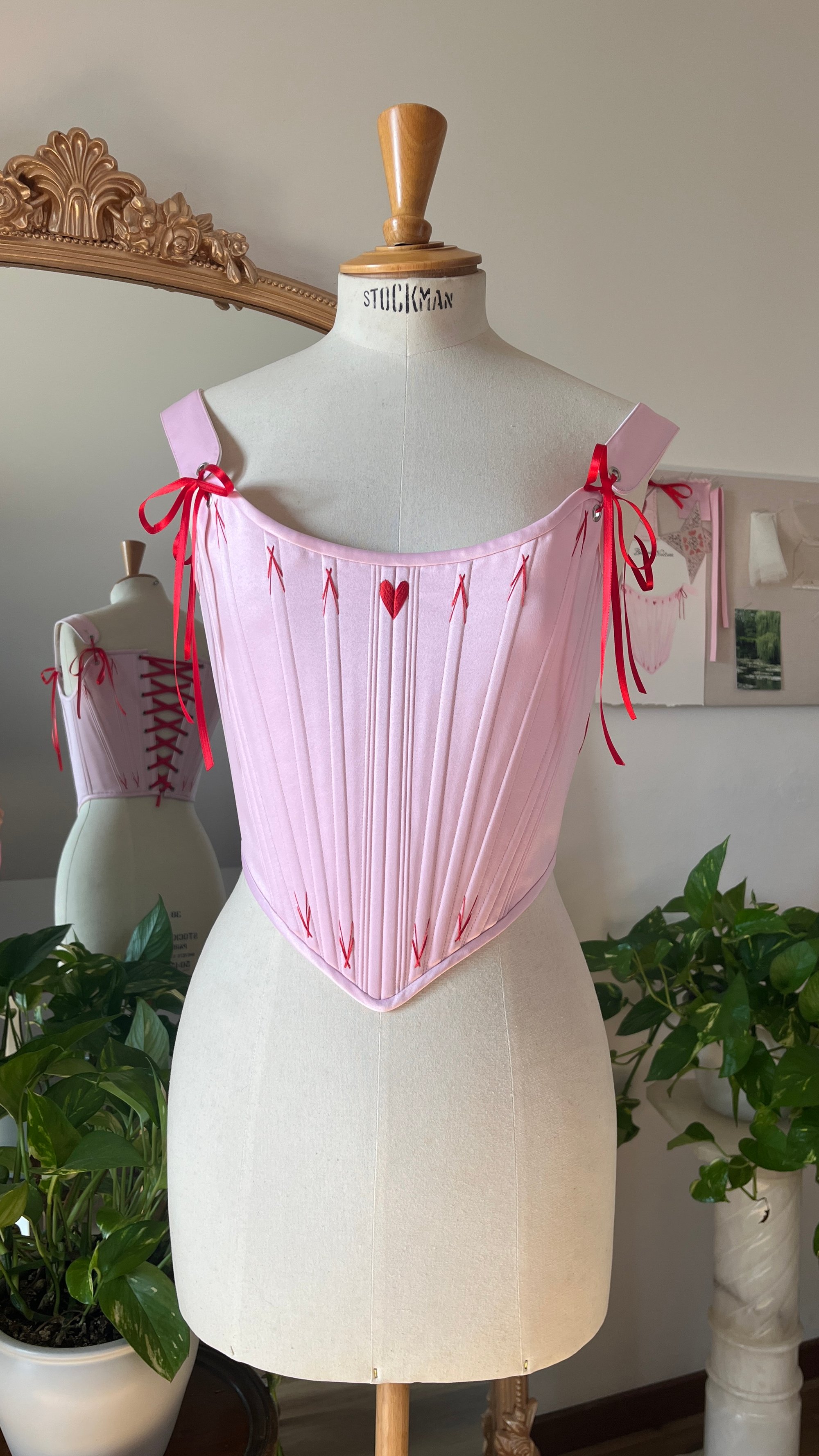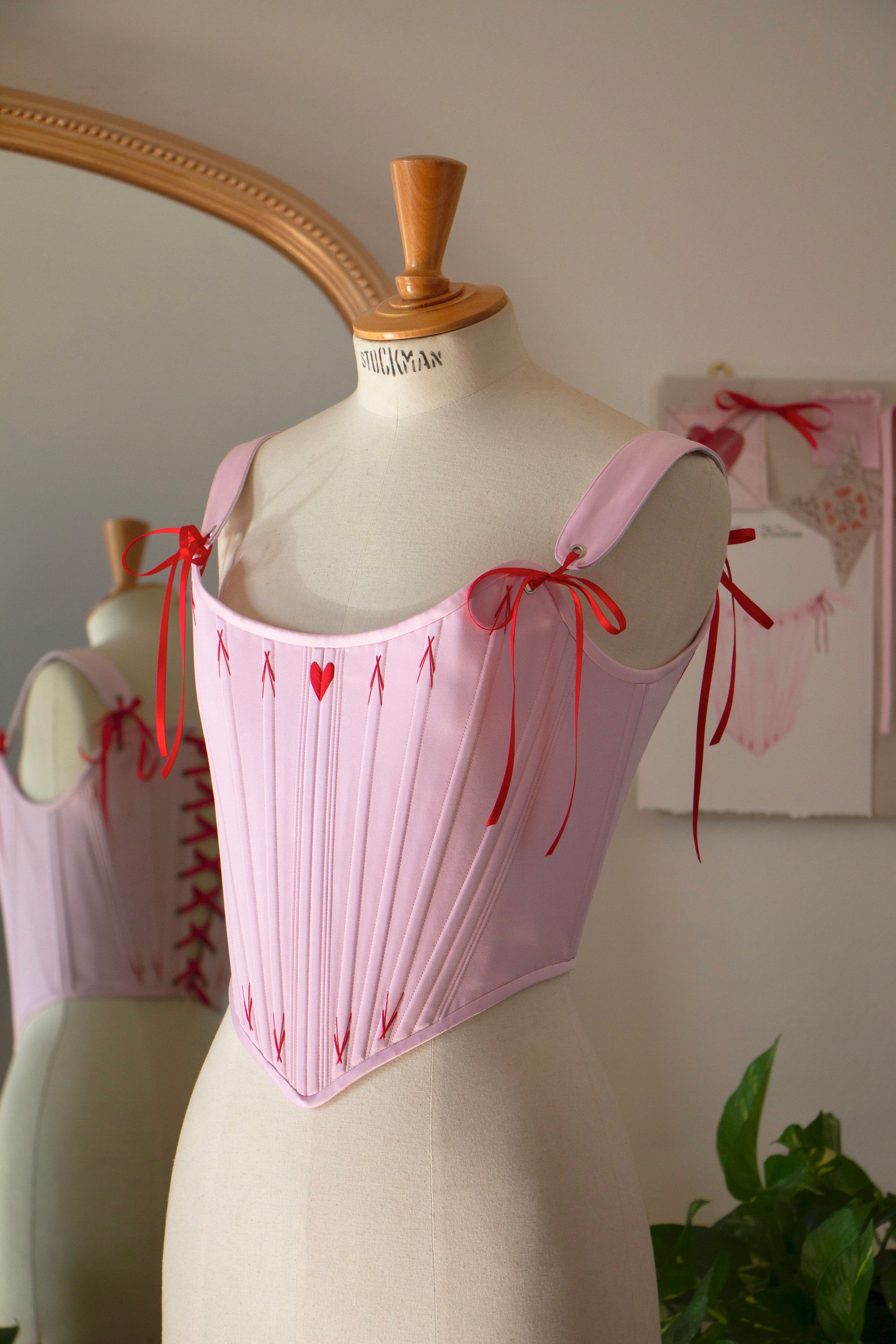 Inspired by the intricate charm of Victorian Valentine puzzle cards, this corset is built upon a strong, fully boned structure. The outer layer is crafted from duchesse satin, while the interior is lined in pure cotton to ensure comfort and breathability against the skin.
